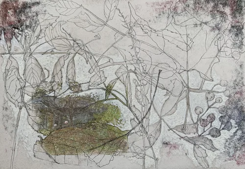 Seeking to reinterpret the myth of Apollo and Daphne from Ovid’s Metamorphoses in a contemporary and well as deeply personal light, this project is a coming-together of my visual imagery with embroidered citations from Ovid’s Metamorphosis as well as passages from contemporary poets and ecofeminist thinkers. The pictorial pieces are oil paint and graphite on recuperated, sanded down mdf board, and the embroidery pieces (in both French and English) are created from coloured threads on scavenged plastics. While a more modest version of this project is being exposed this year in two libraries in Quebec City, the project as proposed to La Centrale is a more ambitious installation of 25 pictorial and embroidered works.